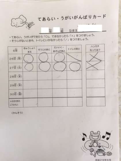 帰りの会では、「てあらい・うがいがんばりカード」に今日一日の振り返りをしています。食中毒や夏風邪等、季節の変化で体調を崩しやすい季節です。子どもたちが健康を保持して元気よく学校生活を送ることができるよう指導を行っています。