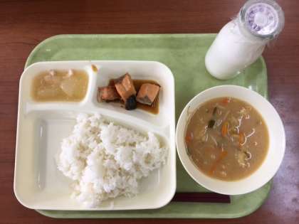 7月6日(木)の給食献立は、さけのさんしょう風味焼き、みそ汁、とうがんの煮物、米飯、牛乳でした。なかでも、とうがんは、果実を食用にする夏野菜です。夏の到来を感じさせる献立が登場しました。