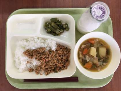 献立は、豚肉とじゃがいもの煮もの・オクラのかつお梅風味・紅ざけそぼろ・米飯・牛乳でした。