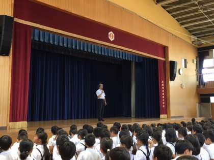 学校長の講話をはじめ、生活指導、健康教育、体育担当の教員からの連絡や諸注意について子どもたちに話がありました。子どもたちは最後まで話を聞いていました。そして最後には元気よく校歌を歌い、子どもたち一人一人が1学期を振り返りました。