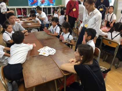 写真は左から1枚目・2枚目は、1年ぶんぶんごま、3枚目は、2年トランプあそびの様子です。