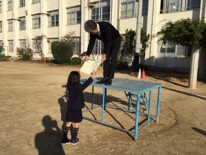11月13日(月)の児童朝会で2年生の児童が、大阪市水道局主催の「水の絵コンクール」で優秀な成績をおさめたので、学校長から表彰されました。