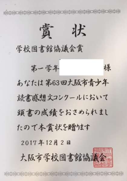第63回大阪市青少年読書感想文コンクールの表彰式を行いました
