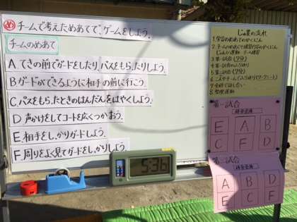 子どもたちは、チームのめあてを達成できるように協力しながら試合を進めていました。お互いを認め合う声かけはもちろん、互いに切磋琢磨しながらがんばっていました。