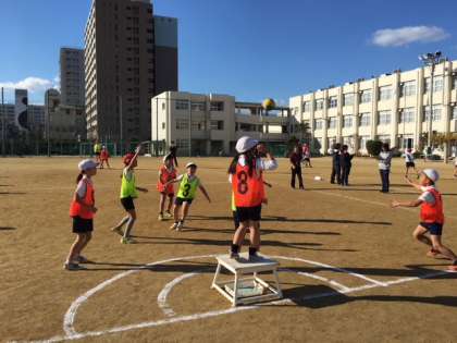 12月6日(水)の5時間目に4年生が授業研究会を行いました。高倉小学校の研究教科の体育で実施し、内容はポートボールでした。