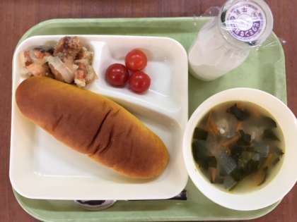 12月11日(月)の給食献立は、さけのマリネ・肉だんごと麦のスープ・プチトマト・パンプキンパン・牛乳でした。