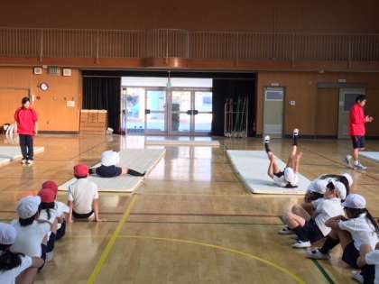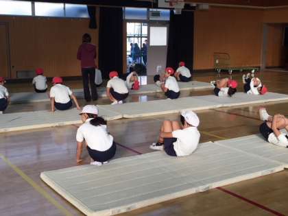 開脚前転において必要である基本的な動作を確認しながら練習に取り組みました。子どもたちは、一つ一つの動作を頭の中でイメージしながら体の動きを覚えていきました。
