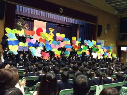 また、2年生の子どもたちは、オペレッタ「はらぺこあおむし」を披露して入学をお祝いしてくれました。そして、最高学年の6年生の子どもたちは入退場の際に、新1年生にやさしく付き添ってくれました。