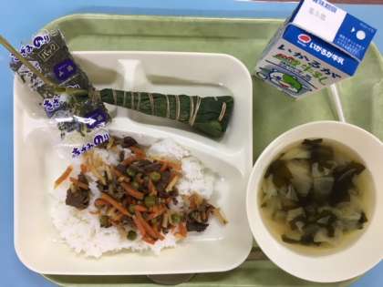 内容は、牛肉のちらしずし(米飯)、すまし汁、ちまき、牛乳でした。
