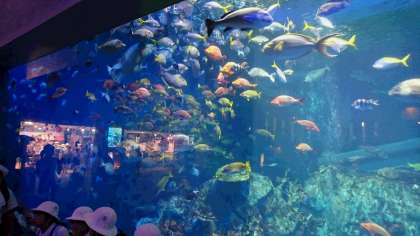 鳥羽水族館、大水槽前から見学スタート。はぐれずに上手に班活動できるかな。