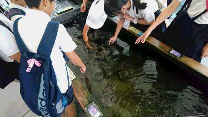 タッチプールの様子です。タコやエイ、カワハギやナマコなど、さまざまな海の生き物と触れ合うことができます。さわり心地はどうでしたか?