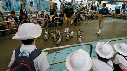 ペンギンのお散歩タイムです。フンボルトペンギンという種類なのですが、この飼育員になるためには、まず一羽一羽の名前を覚えなければならないそうです。この見分け方もぜひ子どもに教えてもらってください。
