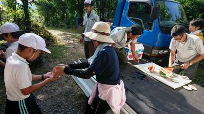 勾玉作りの後、スイカをいただきました。みんな満面の笑顔です。