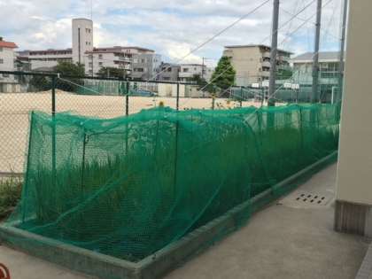 管理作業員と5年担任が暑い中、ネット張りを行いました。すずめにはかわいそうですが、子どもたちが頑張って育てている稲をしっかりと守っていきます。