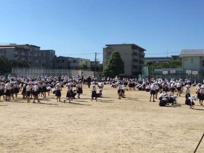 9月3日(月)児童朝会のあと、児童全員と教職員で運動場の石拾いをしました。