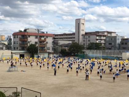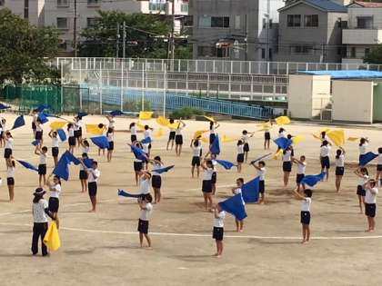 写真は6年生の練習の様子です。フラッグを使って一生懸命タイミングを合わせています。気合の入った演技を見るのが楽しみですね!