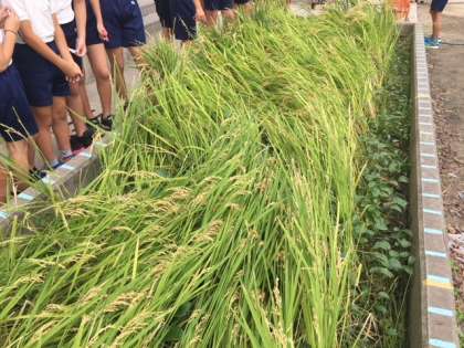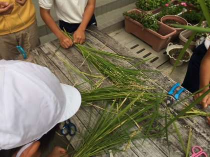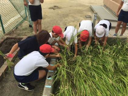 子どもたちは、はさみで丁寧に稲を根本から切りました。そして、はさがけをするために稲を束にしてひもでくくっていきました。子どもたちは一生懸命に育ててきた稲の収穫を丁寧に行っていました。