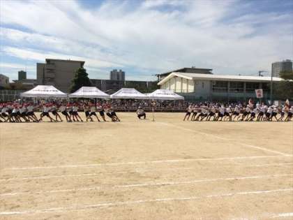 綱引きは、ソーランで鍛えた腰を低くする姿勢を綱引きでも生かしてがんばりました。最後まであきらめず力いっぱい綱を引きました。