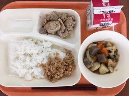 10月5日(金)の給食献立は、豚肉のねぎじょうゆやき・ふきよせ煮・ツナ大豆そぼろ・米飯・牛乳でした。