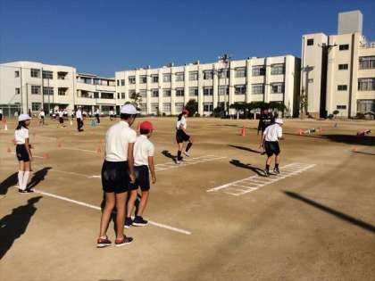 子どもたちは3人のコーチから直接指導していただき、サッカーのトレーニングなどで実際に行われている練習メニューに取り組んでいました。ほとんどの子が、あまり経験のない動き方に戸惑っていましたが、3人のコーチの見事な体の動きからすぐにコツをつかんで上手に運動していました。サッカーの動きの楽しさを覚え、有意義な授業でした。