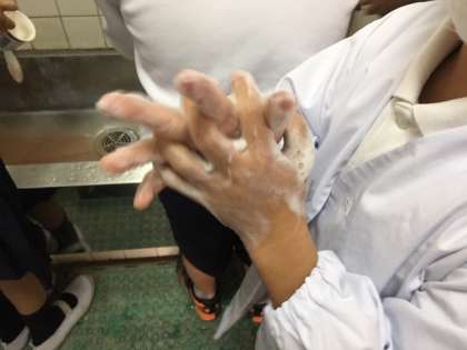 休憩時間が終わった後やトイレの後、そして給食前にも子どもたちは丁寧に手あらいを行っていました。