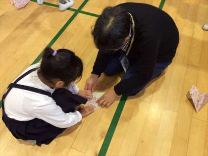 子どもたちの中には、初めて体験した遊びや、何となく知っていても、詳しい遊び方がわからないこともありましたが、お年寄りの方々から親切に教えていただき、いっしょに遊んでくださったので、子どもたちはとっても楽しそうに活動していました。