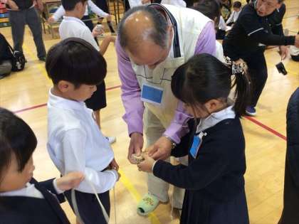 高倉小学校では、ペタンクやディスコン、今回のむかしあそびなどを通して、世代間交流が活発に行われています。