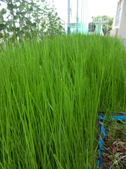 6月に5年生が田植え体験で正門近くの田に植えた稲がすくすく大きくなりました。8月に花が咲くのが楽しみです。