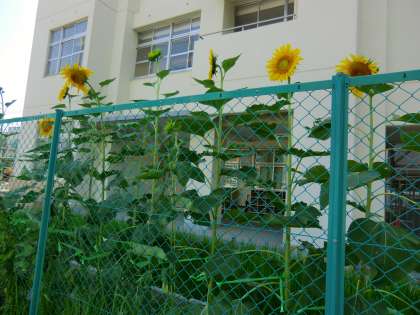 稲の横ではヒマワリが負けじと背を伸ばし、とうとう柵より高くなって花を咲かせました。