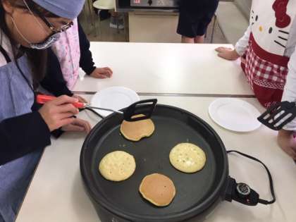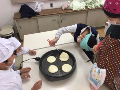ひっくり返すときは少し緊張しましたが、みんなのかけ声にあわせて上手に返すことができました。きれいなきつね色に焼きあがっていたので、みんな大喜びでした。