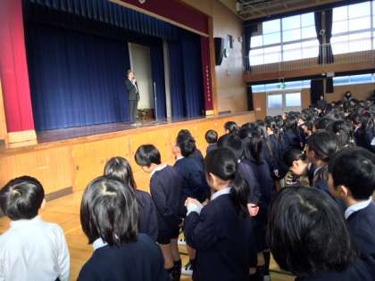 全員で元気よく「あけましておめでとうございます」のあいさつをした後、学校長から3学期に向けての心構えについて講話がありました。