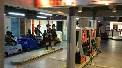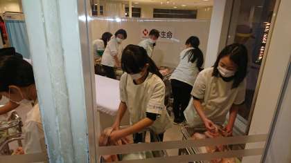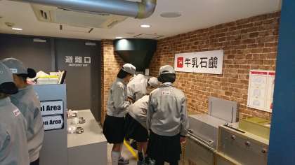 写真は上から、石けん工場・病院(看護師)・ガソリンスタンドでの仕事の様子です。