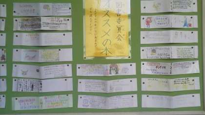 これは、1学期に図書委員会児童が作成し、図書室前廊下に掲示している「図書委員会オススメの本!」です。どの紹介も力作ぞろい。さすが図書委員会のみなさんですね!