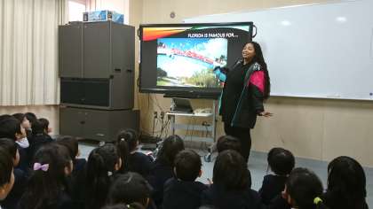 写真は1年生が多目的室において、本校C−NETのジョジョ先生と英語の学習をしている様子です。今日はアメリカにあるディズニーランドとディズニーワールドの違いなどについて教えていただきました。