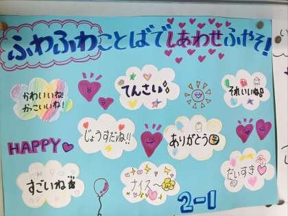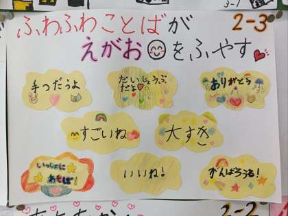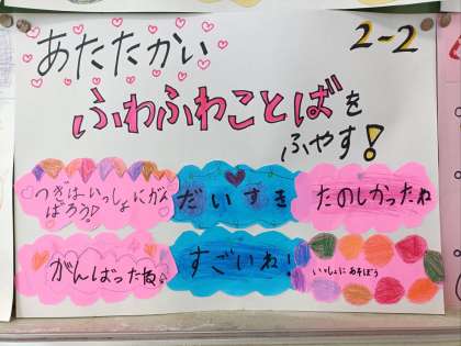 この交流から、「ふわふわ言葉を増やして、笑顔いっぱいの仲良し2年生にしていこう」という結論が出ました。2学期以降も、『ふわふわ言葉』をたくさん増やして、笑顔あふれる2年生にしていきたいです。