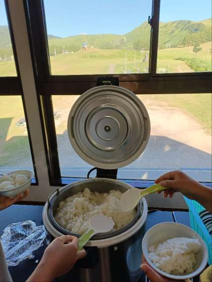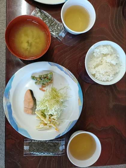 食事係の出番です。みんなで力を合わせて、ご飯、みそ汁を配ったり、のりやお箸を配膳したり、よく頑張っています。