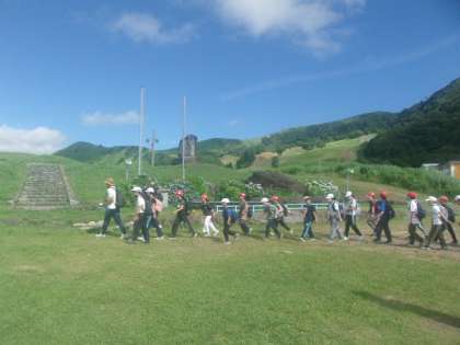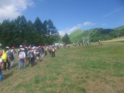 強い風の中、登山に出発しました。ハチ高原のゲレンデの初級・中級コースにあたる草原を登っていく感じです。