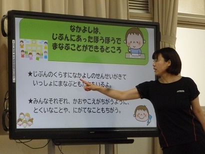 教室で立ち歩いてしまう子は、不安や緊張を人より感じやすく、だから教室をウロウロしてしまうんだよという話をしました。イライラしてしまった時は、なかよし教室の青い箱に入って丸くなっていると落ち着いてくるんだよという説明もスライドを見せながらしてもらいました。教室の中になかよしの先生が来て、その子の横についているのは「大丈夫だよ。」と安心させるためだということも伝えました。