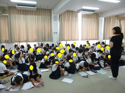 なかよし学級の志野先生が多目的室に1年生全員を集めて「なかよし学級ってどんなところ」という授業をしました。