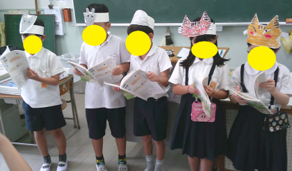 このお話は「与える」ことの大切さがじわじわと伝わってくる素敵な物語です。さすが「宮西達也」ですね。教材の良さに、なりきって読むという「演劇」的な面白さが加わって、すばらしい取り組みになっています。2年生の音読がとにかくかわいいから余計にそう思えるのかもしれません。読み方がねずみたちの純粋な心と悪意はあるがどこか憎めないニャーゴの気持ちとにぴったりマッチしていました。