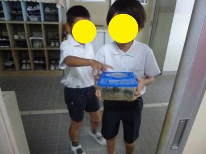 校長室にバッタを見せにきてくれた男子2人。見ると、大人の中指くらいあるでっかいトノサマバッタの成虫。「うわwwすごいね。どこで捕まえたん?」と聞いたら「学校のおいもの畑のところです。」「え?学校で?」