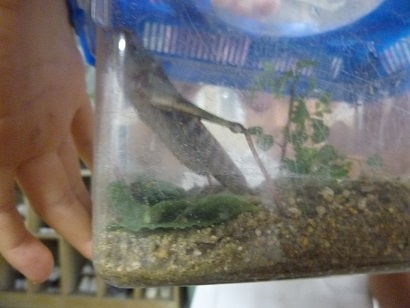 日曜日にどこかの田舎で捕まえて持ってきたのかなと思っていたら、何と高倉小学校の敷地内でさっき捕まえたばっかりとのこと。学校にトノサマバッタがいることがわかってびっくりしました。自然がいっぱいワイルドな高倉小学校でした。