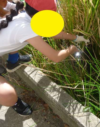真剣な表情で稲を刈り取りました。最初は慣れない鎌の扱いに苦戦する様子も見られましたが、「ザクッ」と音がして稲が刈れると「できたー」と笑顔に。担任の先生が、「2回目もできるよ〜」と声をかけると「やったー」と喜びの声があがりました。刈った稲を束ねる作業にも挑戦し、本格的な「稲刈り」体験になりました。