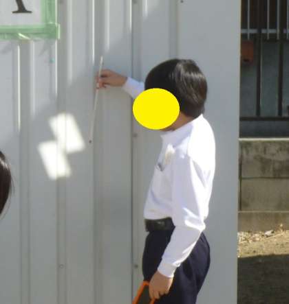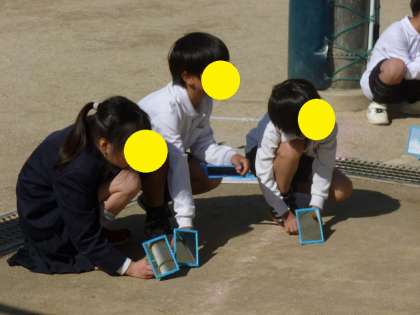 鏡の置き方が難しく、温度計係の子が手で持っている棒温度計の液だめの部分に光を集中しなければならないのでみんな真剣な顔で微調整していました。手で鏡を持ってやるとどうしても反射させた光がブレてしまうので、鏡を地面に置くとうまくいくという方法にたどりつきました。「試行錯誤」してるときって、時間が一瞬で過ぎますね。3年生、よくがんばっていました!今日は、本当にいい天気でした。