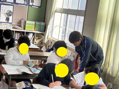 かつての教え子が今の教え子に勉強を教えている姿は、担任にとっては何とも言えない感慨深いものがあります。ちなみに、この生徒も「教員志望」だそうです。学校の先生という仕事は、中学生にとっても子どもたちにとっても魅力的な仕事に見えているのだろうかと時々考えています。社会人の先輩として、我々が仕事をする姿は、子どもたちにとってお手本となっているだろうかと振り返っています。我々教職員が「楽しく」「やりがい」を持って生き生きと働く姿を子どもたちにしっかり見せていきたいと思います。