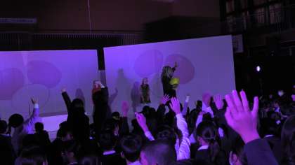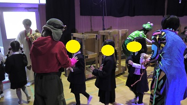 入場するといつもの見慣れた講堂が「異空間」になっていて、それだけでテンションが上がります。劇の途中には、クイズや子どもの名前を使ってのセリフも出てきて、大ウケでした。