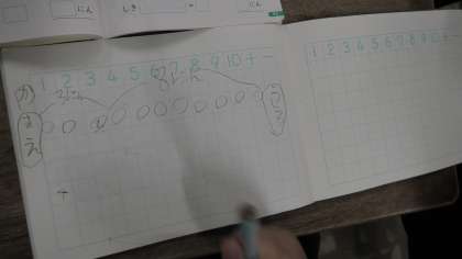 そして、ゆうとくんはどの○になるのか、その後ろに何人いるのかという物語(ストーリー)を式で表現します。ここが難しい。なぜ、引き算なの?と聞かれたらどう説明しようかと悩みましたが、ほとんどの子が自力で9-5と書けていました。