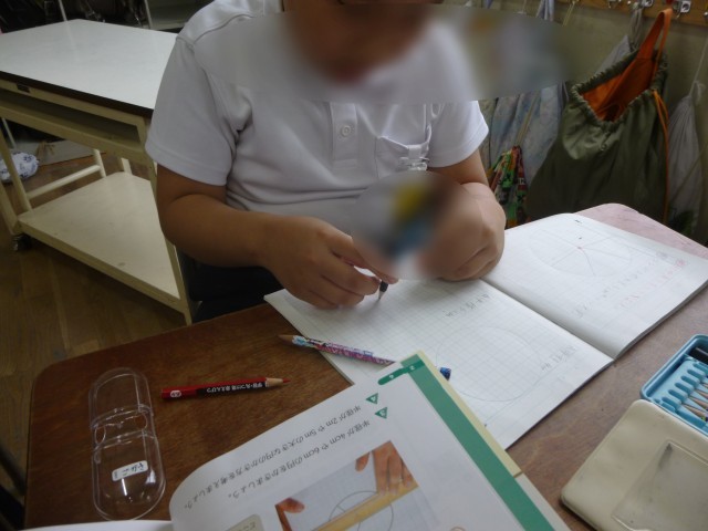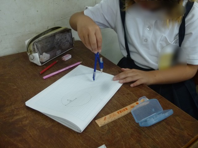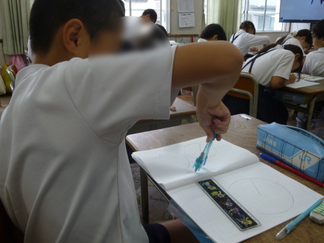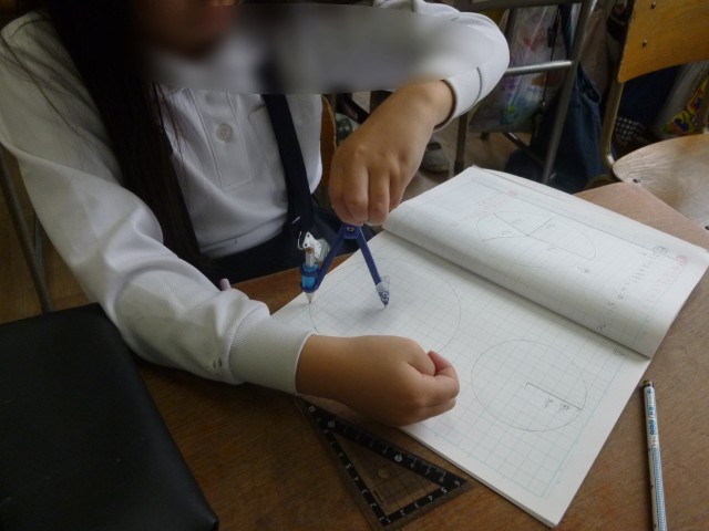 コツのその2は、「下敷きを外す」です。ノートに下敷きを敷いていると、針が滑りやすくなります。数枚の紙を重ねた状態(クッション性がある状態)で描くのが、最も針が安定します。算数の時間のコンパスの授業は、図工科や中学校の技術科で学習する「道具の特性を知って使いこなす」要素があって、見ていて本当に楽しいです。