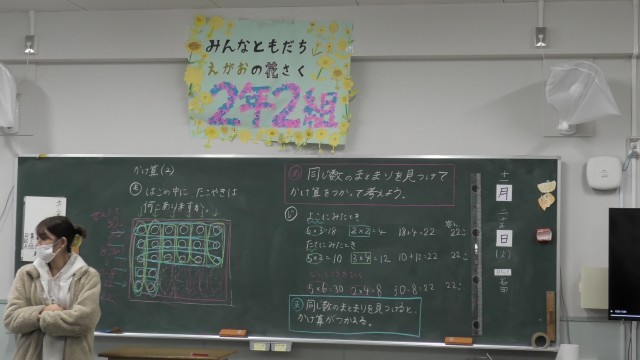 2-2の子たちが「算数の時間はいつも絶対たこやきの問題が出るねん。」とめっちゃ嬉しそうに話してきます。2年生の算数といえばかけ算の九九。たこ焼きという具体的なイメージを使うことで、抽象的な算数の概念がぐっと身近になります。かけ算の基本は「1つ分の数 × いくつ分 = 全部の数」です。 たこ焼きの場合、「舟(箱)の中にあるたこ焼きの数」が「1つ分の数」として固定されやすいため、子どもたちが式の意味を理解しやすくなります。また、 たこ焼き器や箱の中のたこ焼きは、きれいに縦横に並んでいます。これは教科書で重要視される「アレイ図(ドット図)」そのものなので、かけ算の構造(列と行)に気づきやすくなります。