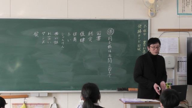 この教室も、とてもいい雰囲気でした。6年生は、卒業式までのカウントダウンが始まってしまう3学期始業式でした。最後に、どんなことしたい?ユーチューブでカラオケ動画を探して、先生が持っているマイクで歌おうか・・・など、わくわくするような会話でみんなとても楽しそうでした。黒板に書かれてある係の名前を見ても、子どもたちのワクワク感が伝わってきますね。
